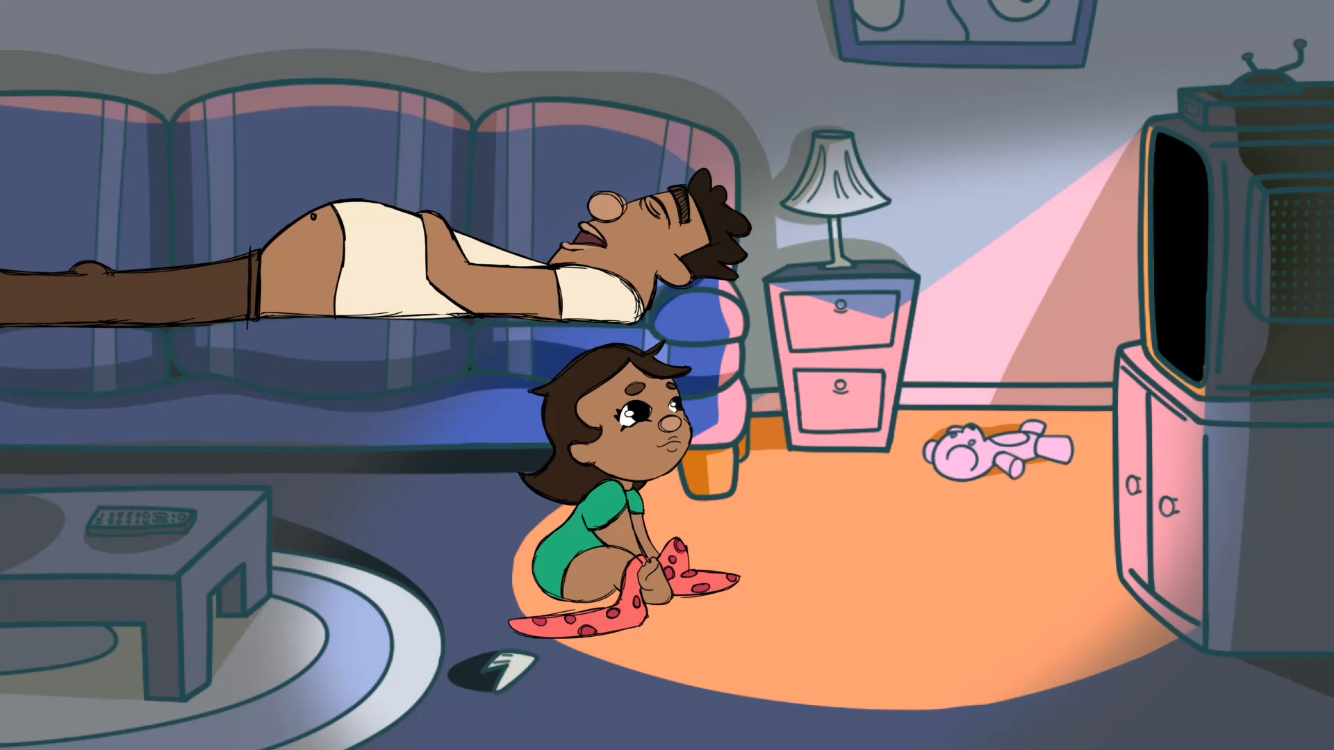 For me, character is usually the starting point to a story, and it was easy to imagine all sorts of situations arising from a character with such a distinctive feature. I wondered, “What’s the worst thing that could happen to someone with a tv on their stomach?” It seemed like not being able to hide that you stole someone’s snack would be a pretty unfortunate side effect!