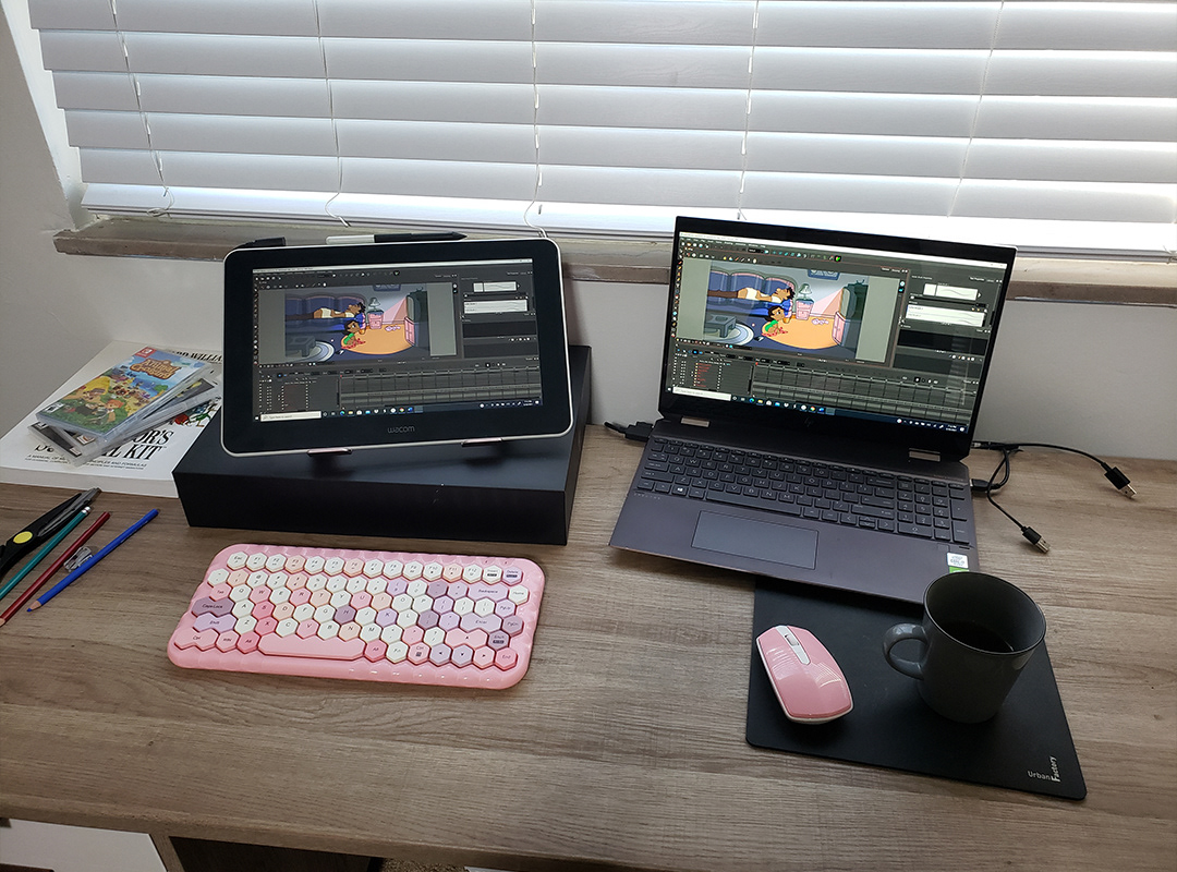 "My workspace is in my bedroom. I work off my Wacom one, connected to my laptop and I used Toon Boom Harmony to create this short. I work best when I have a clear head, so I ended up completely changing my schedule where I started going to bed by 8pm, waking up at 3am and working until I had to start getting ready for work. Sounds crazy, but whatever it takes to get creative time in!!