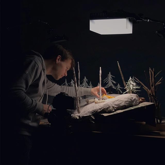 The background, on lower glass, is dried silk paper but animated elements, on upper glass, are wet silk paper. Once wet, it sticks to the glass and I can deform it and shape it as I want. For that reason it is different from cut out. Finally I animate (using Dragon Frame), edit the video and add some sounds."⠀