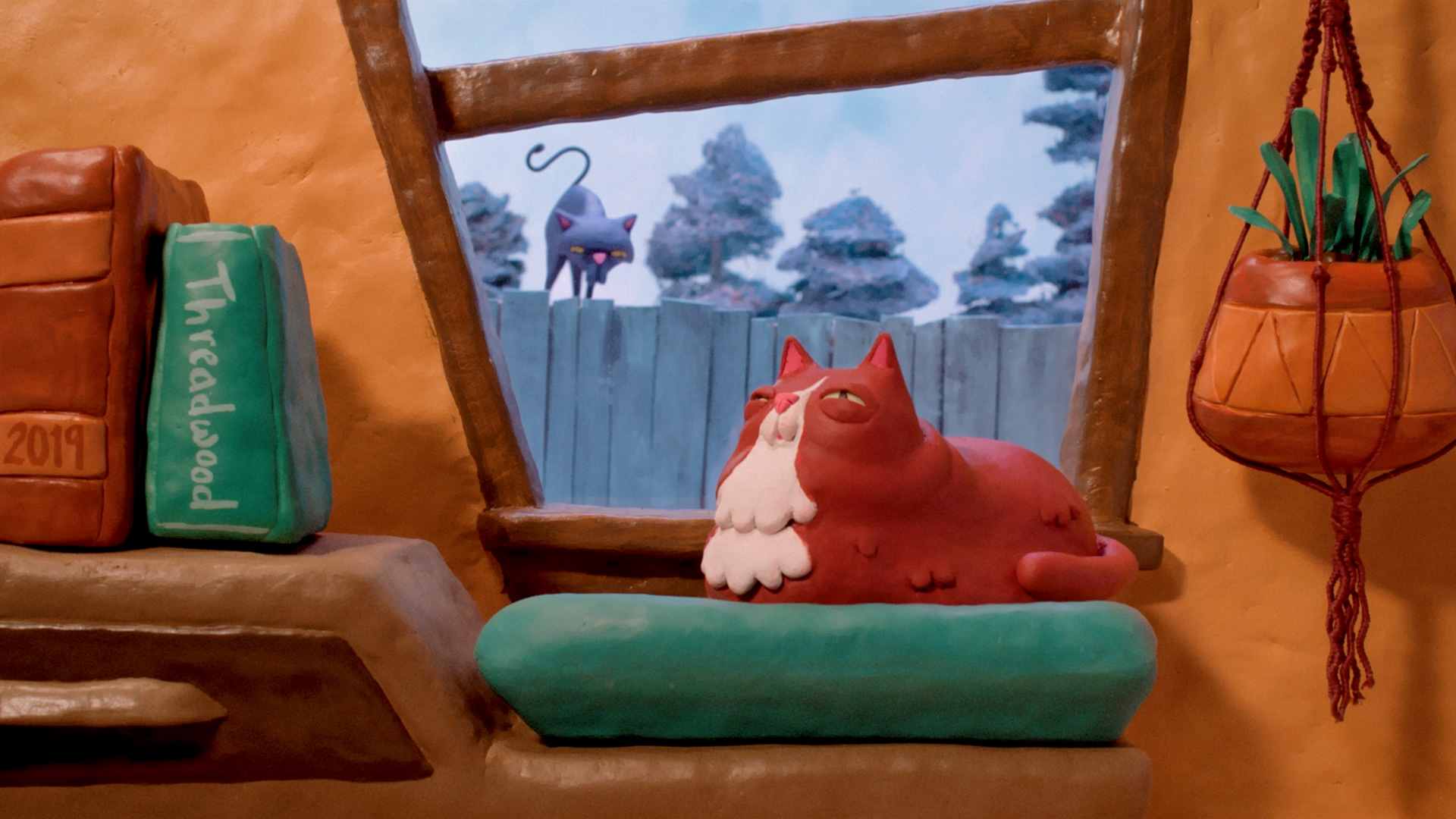 We wanted the colors of the set to reflect the cats- the warm, cozy indoor cat and the cold, unsettled outdoor cat. The set was built with wood, coated in a clay material that air-dries, then painted. We animated the hanging plant on a separate animation pass/take because the set was a little tight and we didn't want it to be bumped accidentally during the cat animation."⠀
